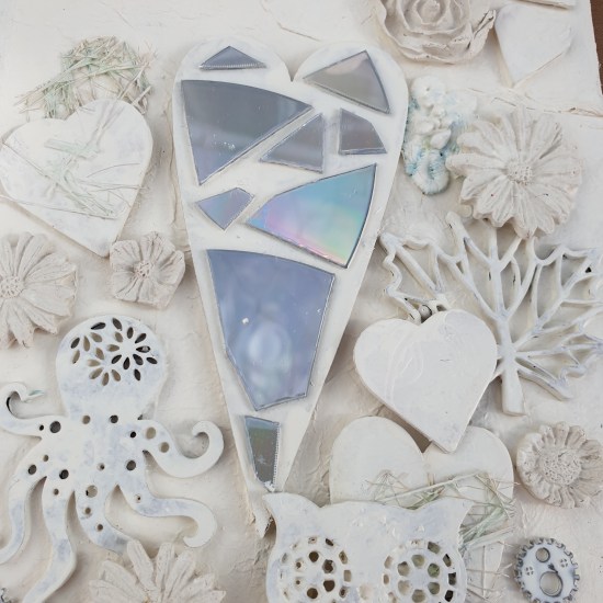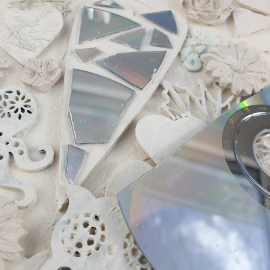 Powertex is great for upcycling and I am using an old DVD to add extra sparkle to this project. I have also used a mixture of fabric, metal, wooden, stone art and MDF shapes to add the detail.