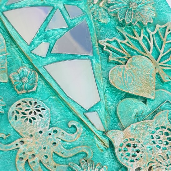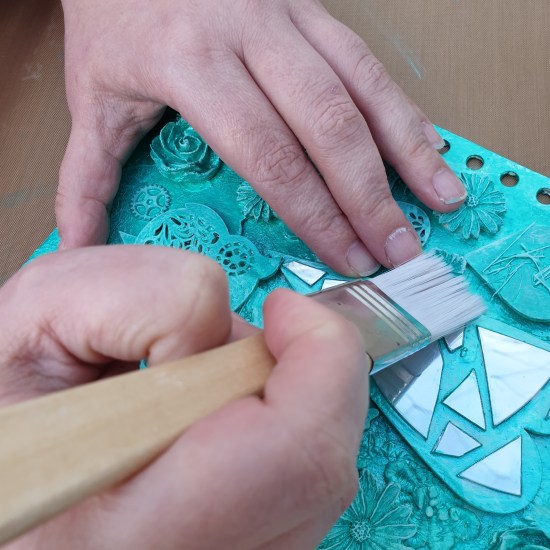 The key when colouring around mirror or DVD with Powertex is to have a damp brush available at all times to keep wiping the surface of the mirror to keep it clean. Don’t let your ink or pigments dry or you could be left with an unintended feature!