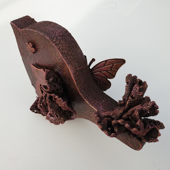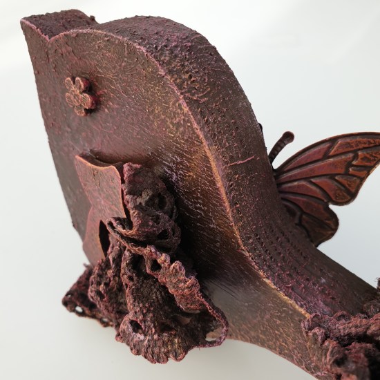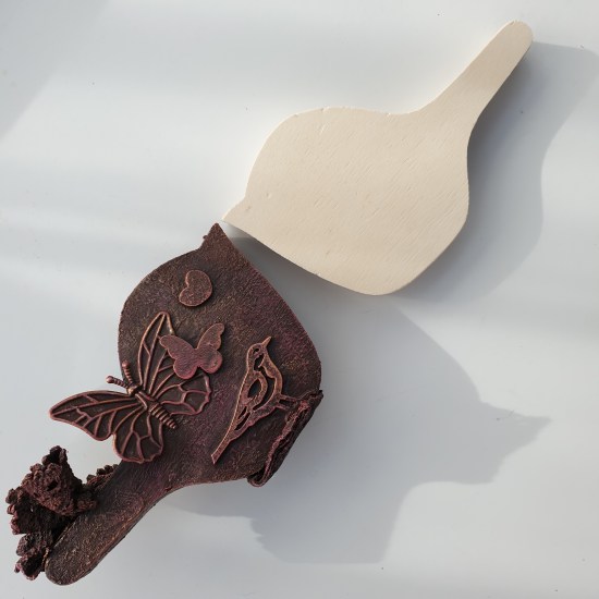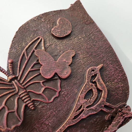 I’ve used a mixture of MDF shapes (toadstools, hearts, butterflies and birds), metal shapes (flower for eyes and a butterfly) and lace both as the wing and folded to create feet and give the bird stability.