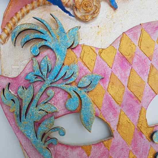 You can add texture to Powertex projects, such as the diamond pattern on the eye mask and the mosaic pattern on the base by adding a layer of Easy Structure applied through a stencil. The braid and rose around the base of the hat us made with stone art and silicon moulds.
