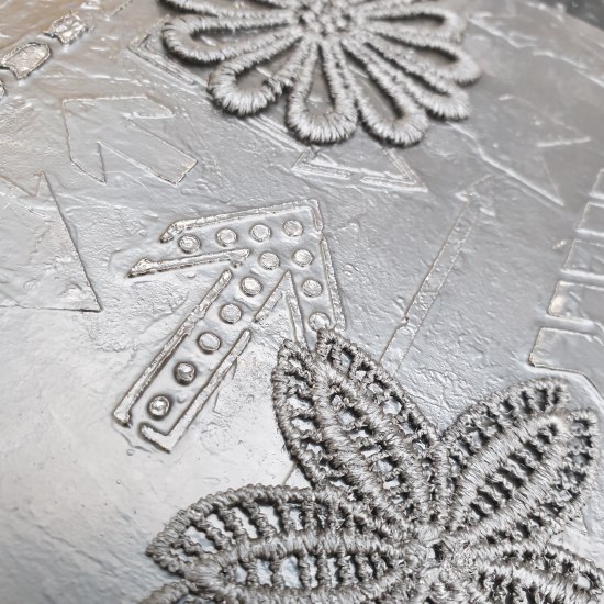 Powertex makes a great glue, I cover both sides of the base and edge before adding a layer of EasyStructure and lace shapes covered in Powertex.