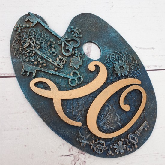 I started with dry brushing the whole of the shape (front and back) with a mixture of turquoise and blue with a hint of rich gold. I then added more pigment with Easy Varnish to make a paint to highlight the numbers.