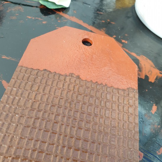 I covered the whole tag in 4 layers of pigments – Rose, a Rose and White mix, Metallic Red and finally a dusting of light gold. I think I may play with the colours some more.