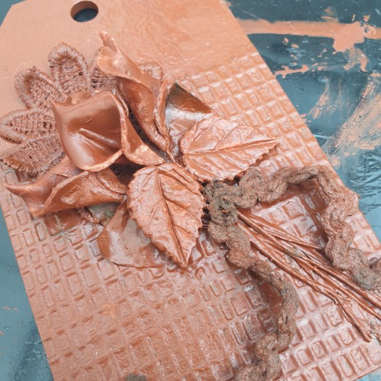 I went for a monochrome look, so coloured everything with Terracotta Powertex, the foam flowers need a good coat to stay covered.