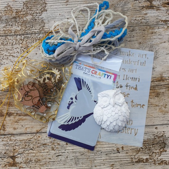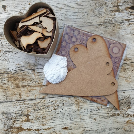 On the love theme there is an MDF heart and a heart box. A plaster owl and two stencils bring the themes together.