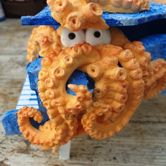 I coloured a small piece of Heartysoft clay with orange pigment. I moulded some into octopus tentacles from Katy Sue Designs and shaped the head snd the eyes free hand.