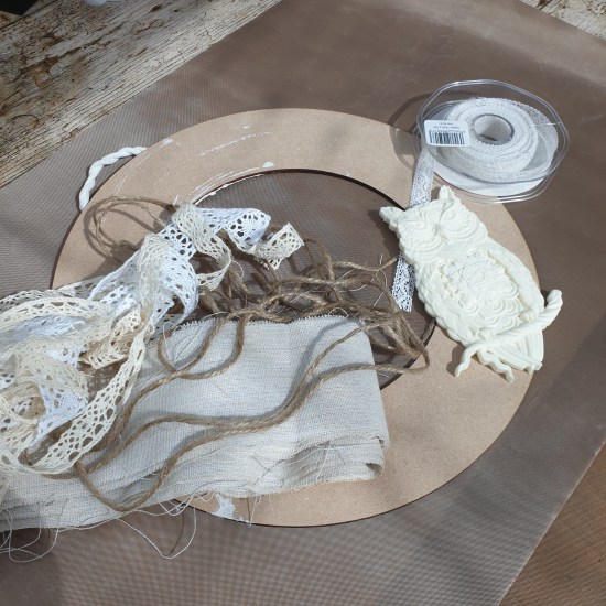 Our annual Powertex Wreath class uses an MDF ring especially made for us by Infinite Crafts in Street, decorated with calico, jute and lace as a base and a range of embellishments.