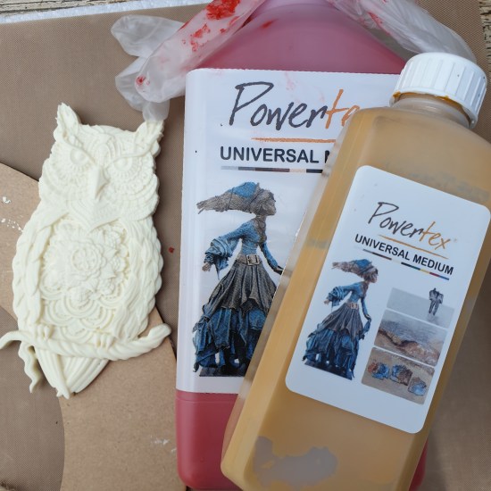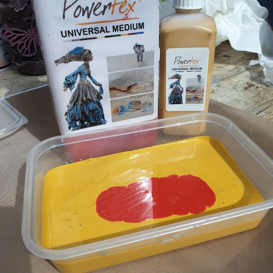 Most of the coloured Powertex’s dry slightly darker, especially red, blue and green so you need factor this when mixing. I use a silicone palette knife to mix colours as its right mix of flexibility and firmness.