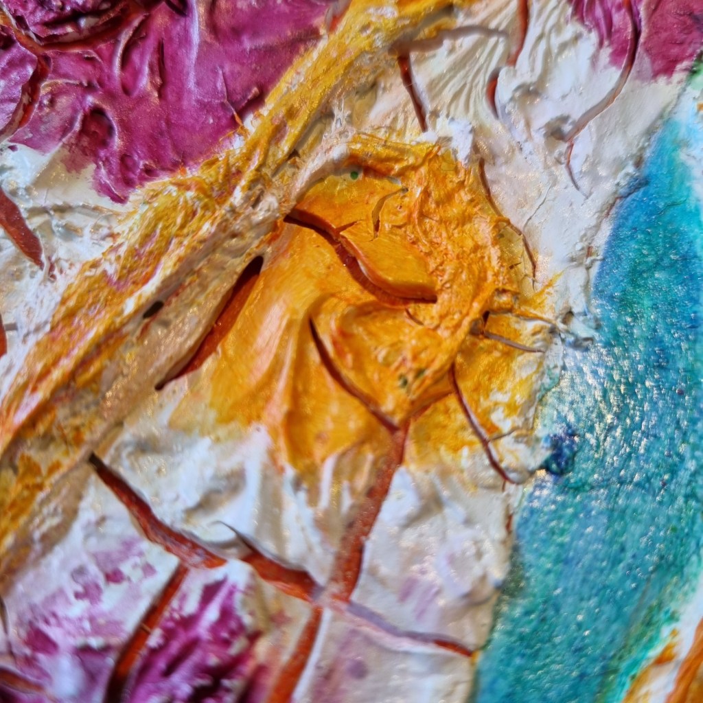 When mixed with a little bit of pigment and transparent Powertex you can create a paste which is bright, bold, has a sheen and is easy to apply.