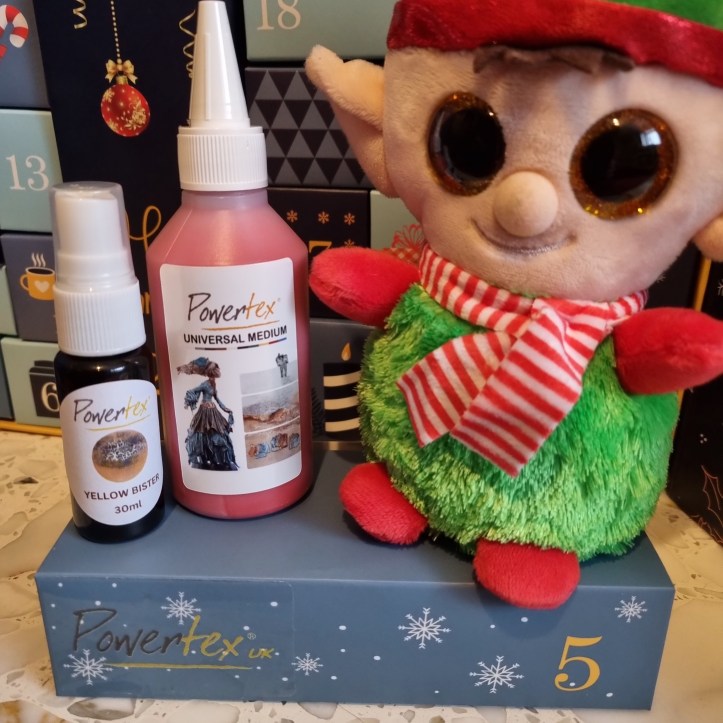 And we have not one but two gifts, firstly a small bottle of Red Powertex and a sample of Ready Made Yellow Bister. Looks of rich colours perfect for Christmas