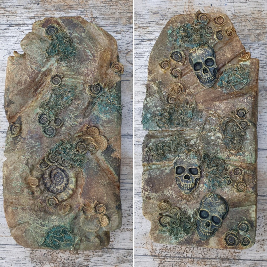 This Fossil project is made with grey Powertex and Stone Art. Apart from a thin layer of gold dry brushing, it is only coloured with Bister. As you can see, you can get some real depth with Bister as it soaks into the Stone Art.
