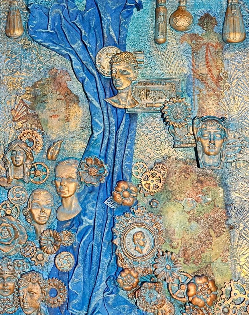 With this project, I started with a coat of blue and white Powertex before fixing the Rice Paper with EasyCoat Glossy. To help blend the paper in, I added EasyStructure before finishing with cloth and embellishments.